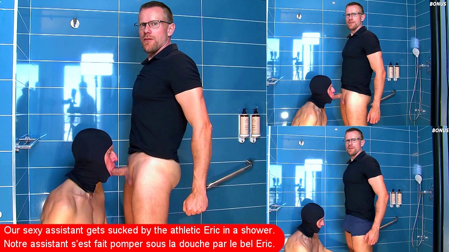 a sucé la grosse bite de notre assistant et ce sous la douche. Eric a tout avalé avec plaisir.